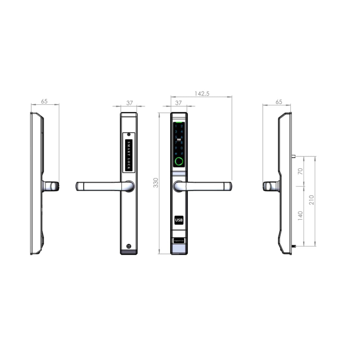 Замок електронний розумний вузькопрофільний призначений для встановлення на металопластикові та алюмінієві двері. Ширина замкової накладки становить 37 мм. Висота накладки — 330 мм. Корпус накладок виготовлений з нержавіючої сталі. Замок постачається без додаткового покриття — у природному вигляді або з чорним покриттям. Керування замковим механізмом реалізується за допомогою повороту ручки: вниз — відкривання як засувки, так і ригеля замкового механізму; вгору — закривання замка за допомогою висування ригеля. Необхідно, щоб наявний замковий механізм підтримував вказаний алгоритм роботи замка.