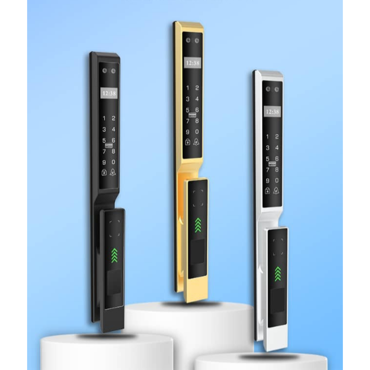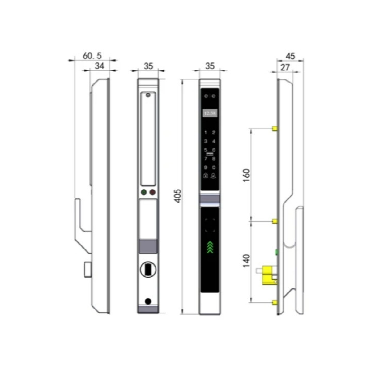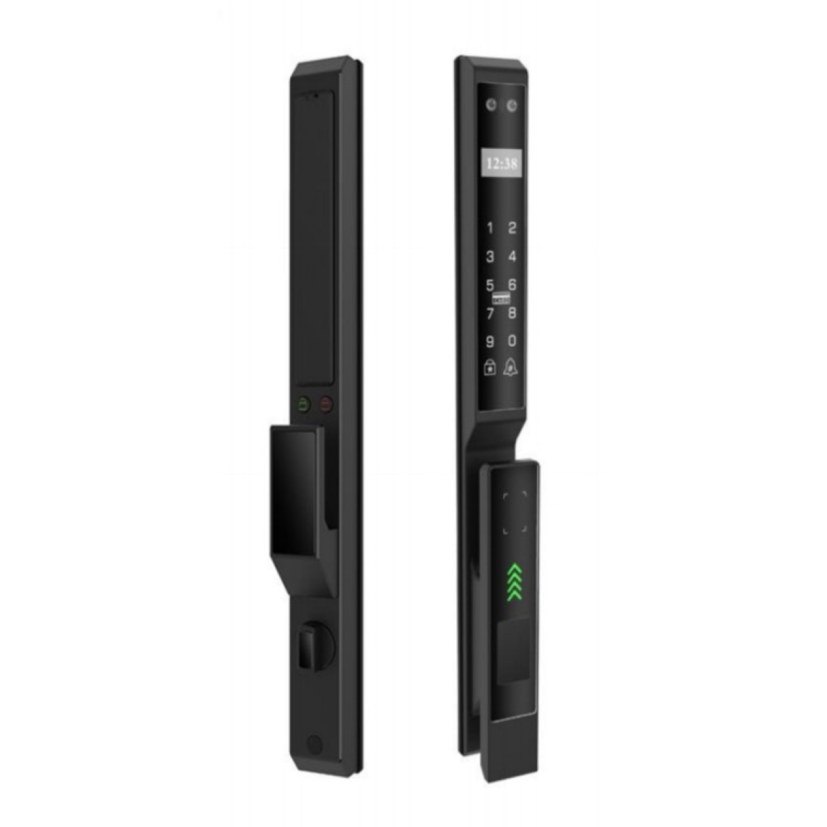 Замок електронний розумний вузькопрофільний призначений для встановлення на металопластикові та алюмінієві двері. Ширина замкової накладки становить 35 мм. Висота накладки — 405 мм. Корпус накладок виготовлений з алюмінієвого сплаву. Замок постачається без додаткового покриття — у природному сріблястому вигляді, в золотавому втгляді або з чорним покриттям. Керування замковим механізмом реалізується за допомогою моторного механізму, що керує поворотом циліндра замка. На внутрішній наклоадці маємо жві кнопки керування (відкрити, закрити) та поворотний привод циліндра від руки. Зовні на фронтальній накладці відсутні поворотні механічні елементи.. Закриття замка реалізується через натискання на кнопку Закрити. вгору — закривання замка за допомогою висування ригеля. Необхідно, щоб наявний замковий механізм підтримував вказаний алгоритм роботи замка.